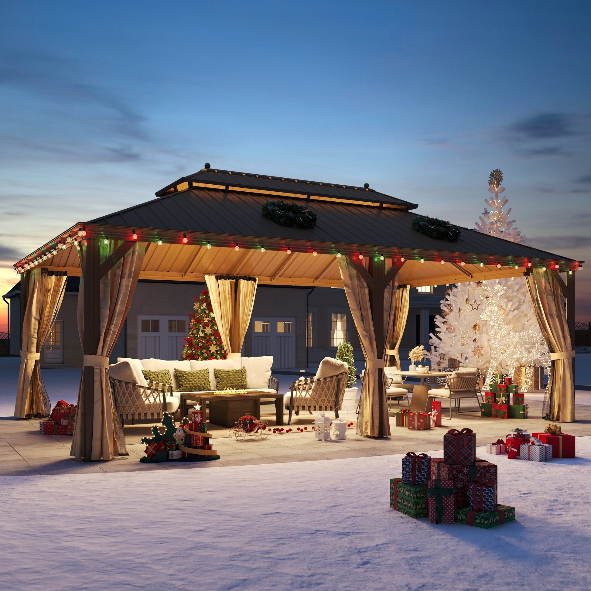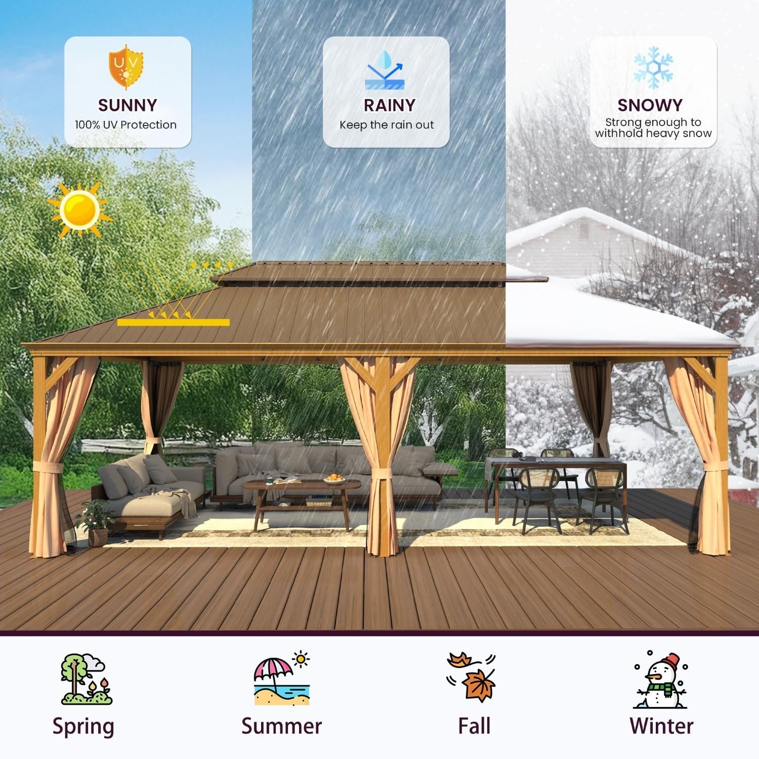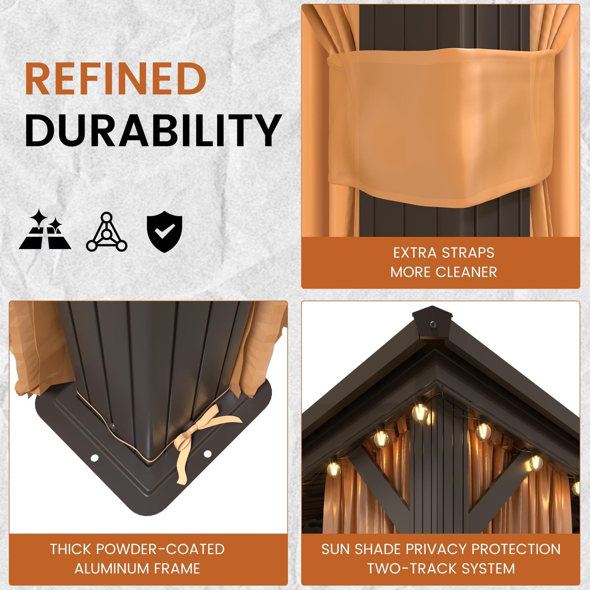 Tonnelle d'extérieur à toit rigide avec double toit en acier galvanisé et cadre en aluminium, pergola extérieure avec rideaux et filets haut de gamme