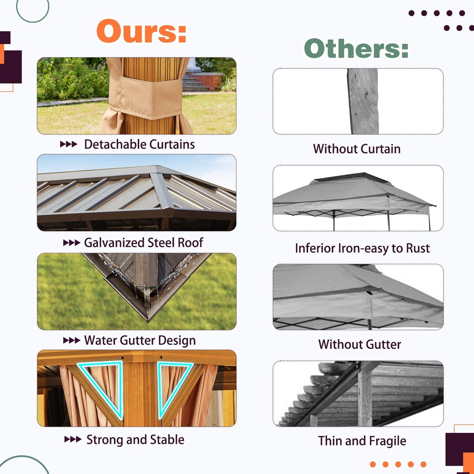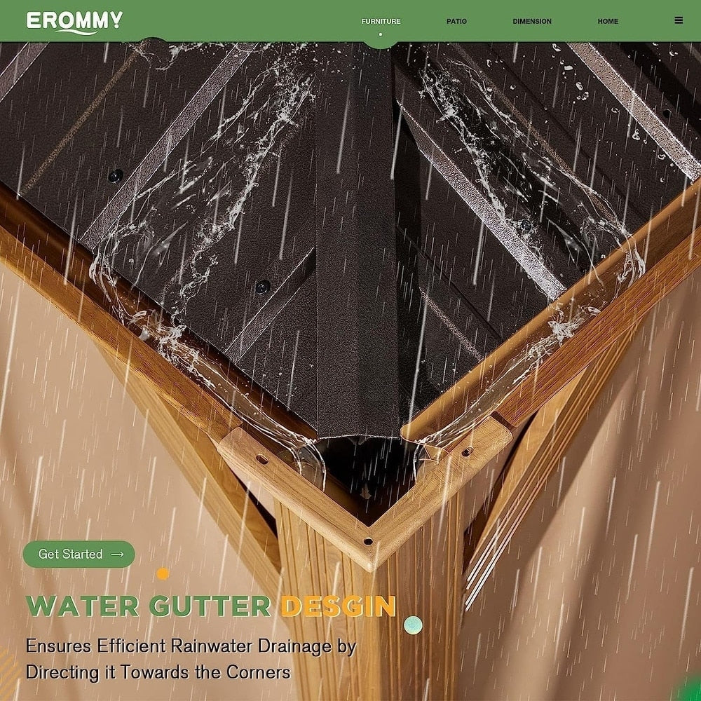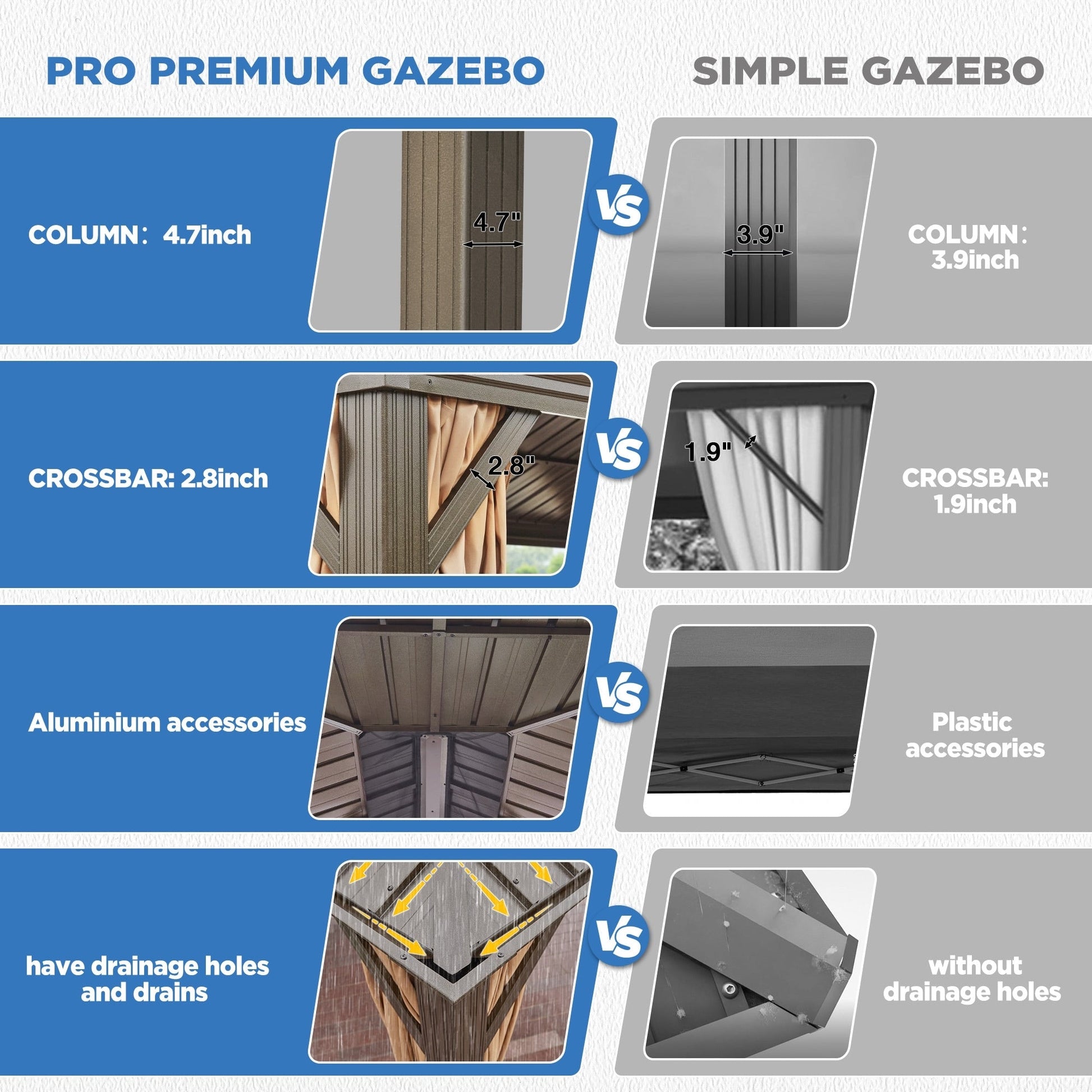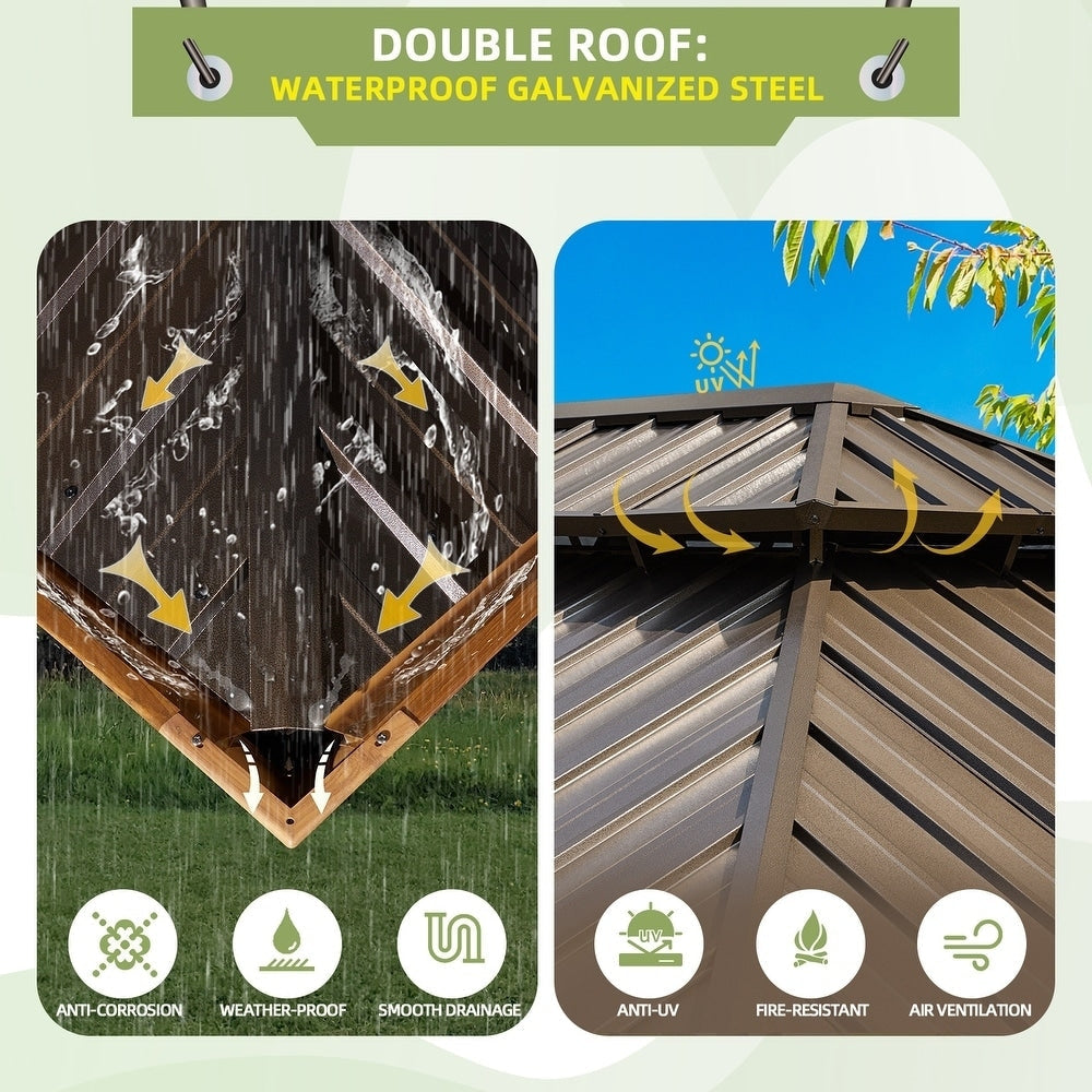 • Pour les gazebos compacts (moins de 12' x 20') : Comprend des avant-toits inclinés avec une conception d'écoulement aux 4 coins — l'eau de pluie s'écoule naturellement le long des bords inclinés pour un drainage en douceur.