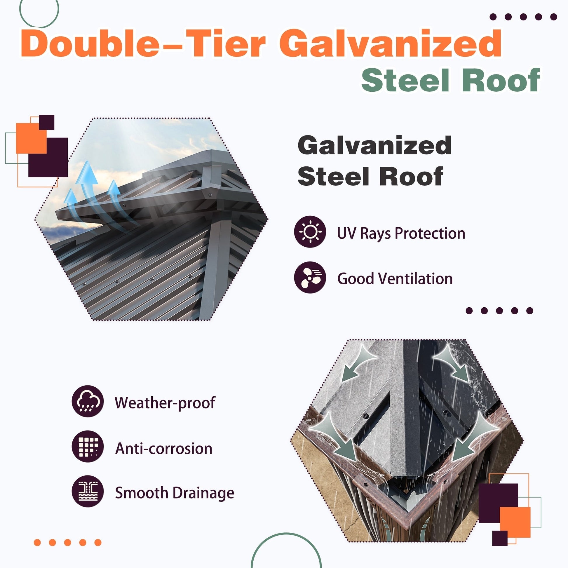 Le toit du gazebo à toit rigide est en acier galvanisé avec revêtement en poudre, ce qui non seulement améliore la capacité du gazebo à résister au vent et à la neige, mais l'isole également du contact direct avec l'air, le rendant moins sujet à la rouille et prolongeant sa durée de vie.