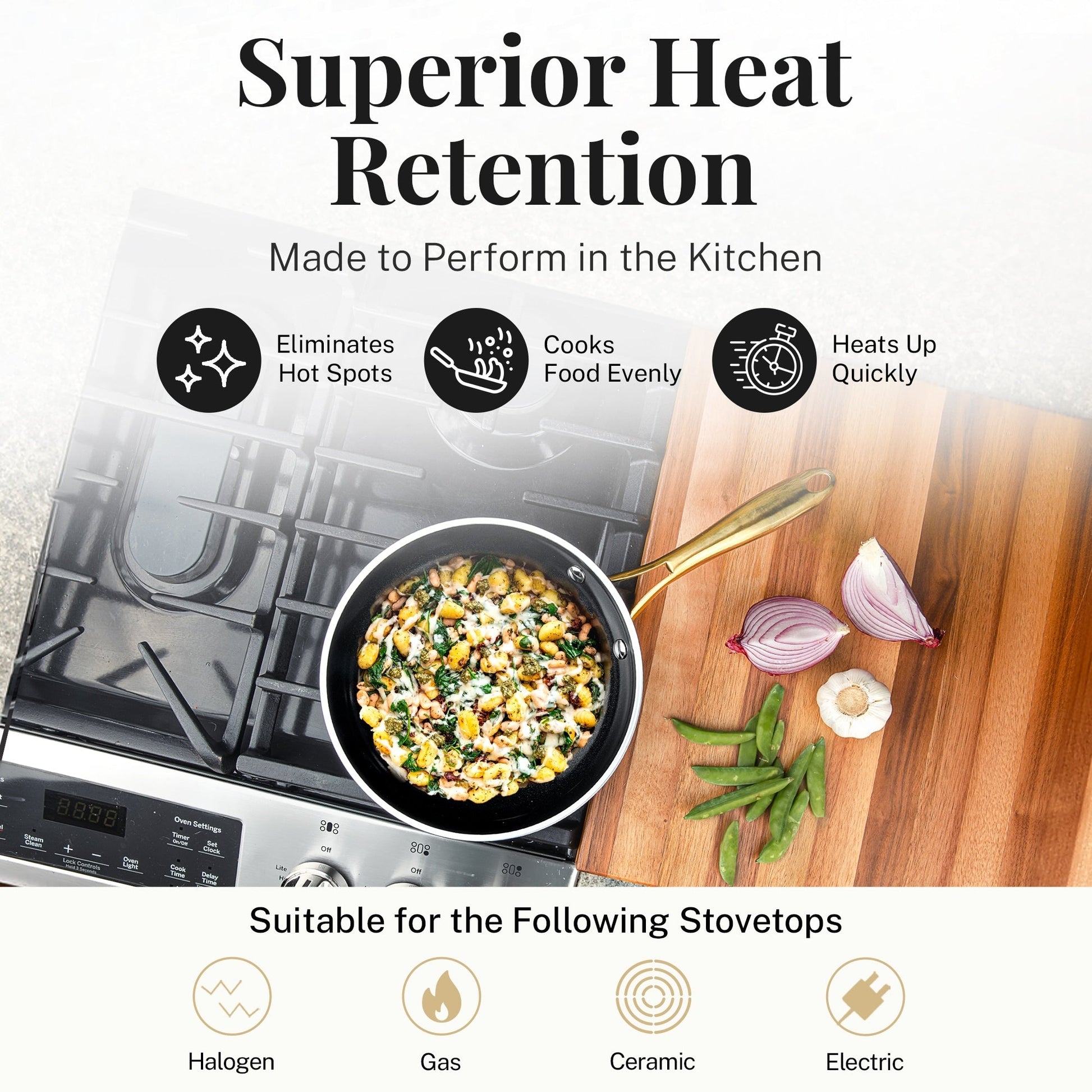 Polyvalence du four et de la cuisinière : Convient aux cuisinières à gaz, électriques, en céramique et halogènes, et au four jusqu'à 500 °F, permettant une flexibilité de cuisson de la cuisinière au four.