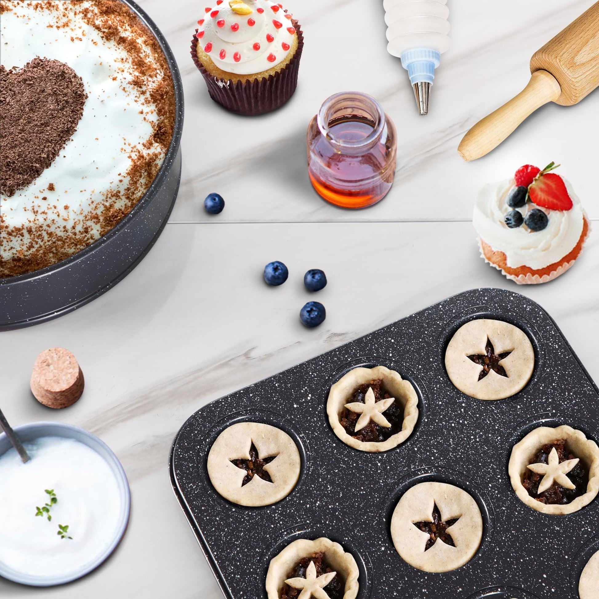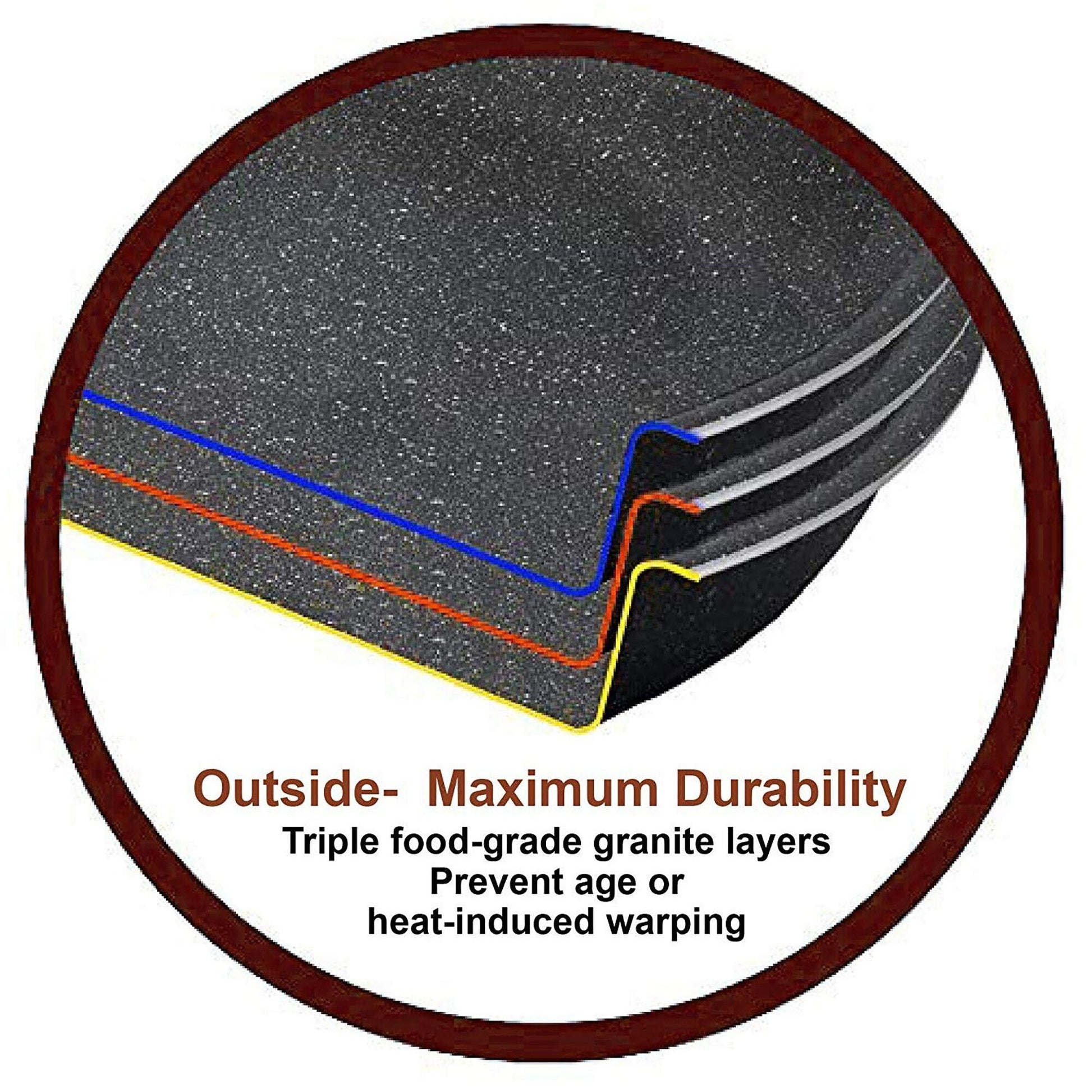 Préparez des plats savoureux avec notre batterie de cuisine antiadhésive avec revêtement en granit. Chaque pièce est dotée d'un fond en aluminium forgé pour une cuisson uniforme sur tous les feux, y compris l'induction. L'extérieur en granit alimentaire triple couche offre une durabilité et une résistance exceptionnelles à la déformation, tandis que l'intérieur recouvert de marbre naturel facilite la cuisson et le nettoyage. Les poignées en bakélite aspect bois apportent une touche d'élégance à cet ensemble polyvalent.