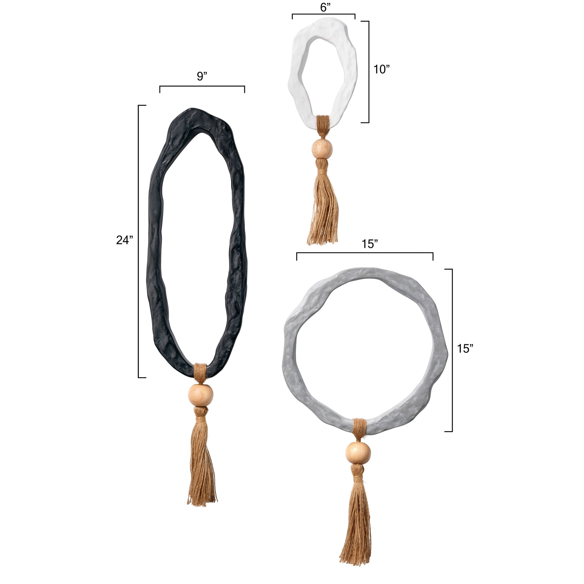 Inspiré des designs orientaux, cet ensemble de trois suspensions décoratives créera un point focal saisissant sur votre mur. Fabriqués à la main en résine, ces anneaux organiques aux formes libres sont ornés de perles de bois et de corde en sisal. Accrochez-les en rangée décorative ou individuellement, comme ornements décoratifs dans toute pièce nécessitant une touche d'originalité.