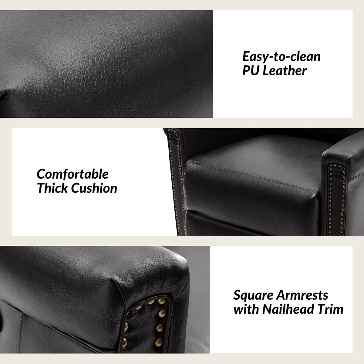 Garniture de clous en cuivre : ornant les bords du cadre de l'ensemble de fauteuils inclinables, la garniture de clous en cuivre ajoute une touche de sophistication et de raffinement, accentuant le charme traditionnel de l'ensemble de fauteuils inclinables et conférant une esthétique luxueuse à la conception globale.