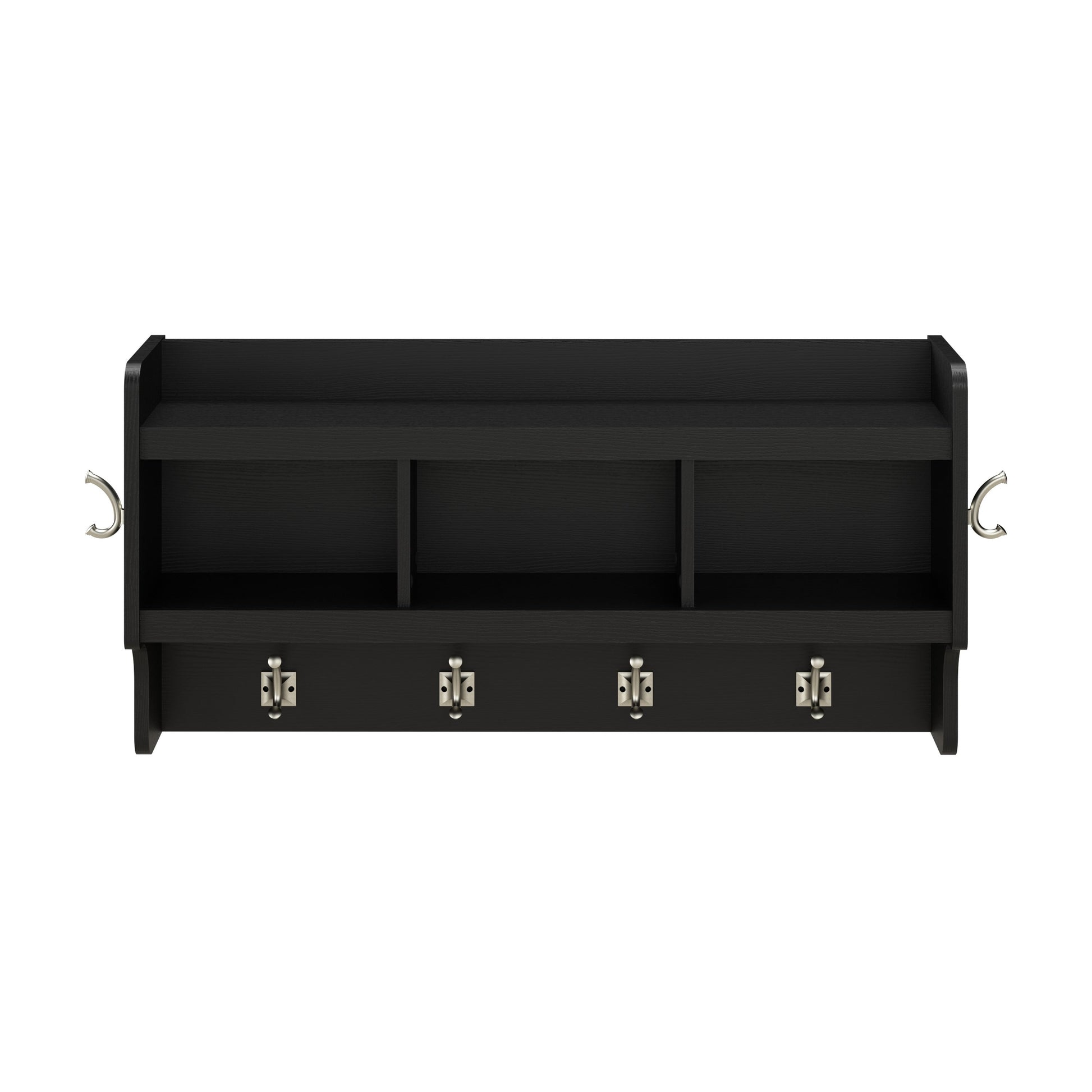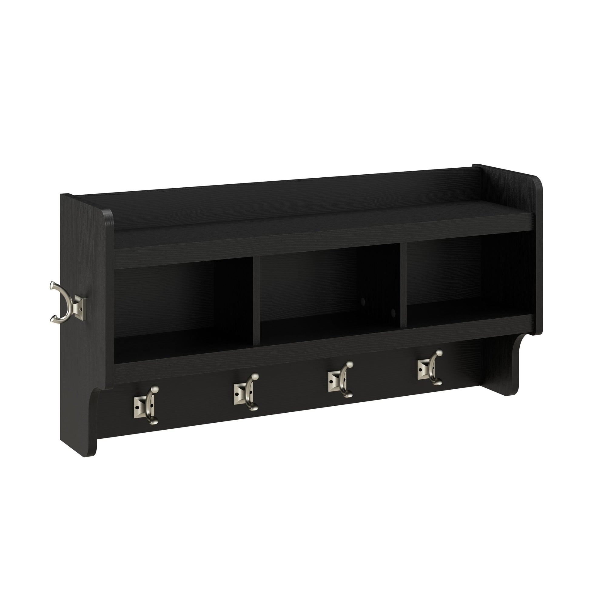 L'étagère murale comprend quatre crochets à double broche à l'avant et un de chaque côté pour accrocher des vestes, des chapeaux, des écharpes et plus encore