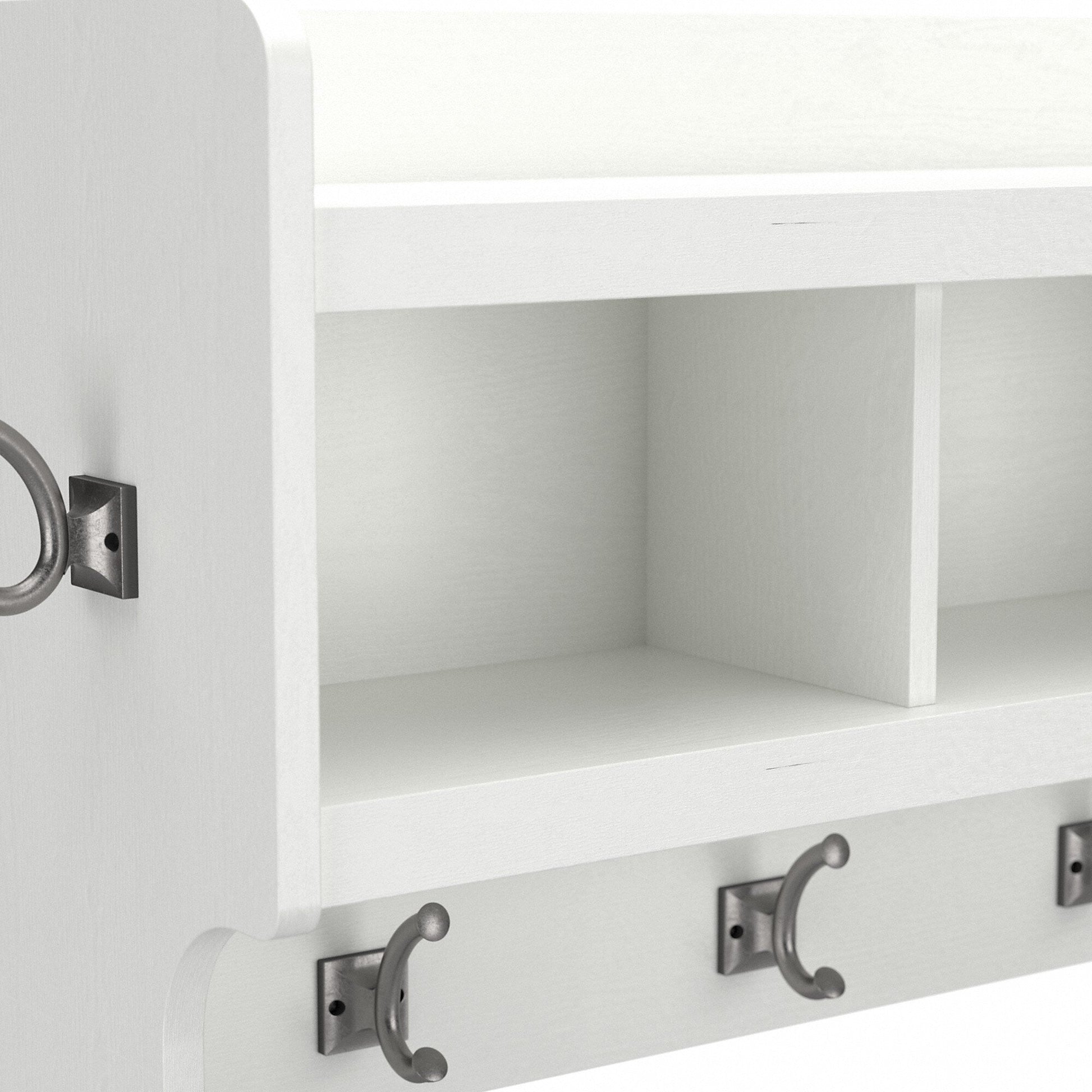 Le porte-manteau mural Woodland 40 W de Bush Furniture avec étagère allie style transitionnel et design pratique pour un rangement idéal dans l'entrée. Rangez vos vêtements et autres essentiels du quotidien en un seul endroit pratique, pour que tout soit toujours là où vous en avez besoin lorsque vous sortez. L'étagère murale est équipée de quatre patères en nickel patiné à l'avant et d'une de chaque côté pour suspendre vestes, chapeaux, écharpes et autres articles. Les petits objets comme les gants et les clés peuvent être rangés soigneusement dans trois compartiments ouverts, tandis que l'étagère supérieure offre un espace pour égayer votre entrée avec des décorations. Les patères supportent jusqu'à 6,8 kg, et la capacité de charge totale de l'étagère murale est de 11,3 kg. Le design transitionnel de ce porte-manteau mural allie des éléments contemporains et traditionnels pour s'harmoniser avec une large gamme de meubles. Le choix de finitions attrayantes vous permet de trouver facilement le style idéal pour votre intérieur. Cet organiseur mural d'entrée a été rigoureusement testé pour répondre aux normes de sécurité, de performance et de durabilité de Bush Furniture et bénéficie d'une garantie fabricant de 3 ans. Découvrez la collection Woodland complète pour compléter avec style votre entrée, votre vestiaire ou votre hall d'entrée.