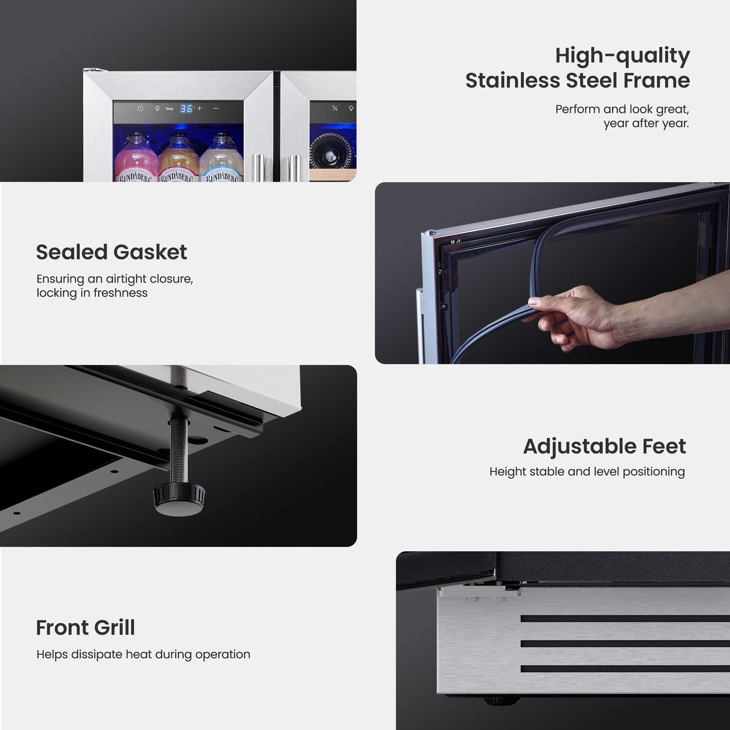 • Design sûr et élégant : Le verre résistant aux UV et la construction en acier inoxydable garantissent une durabilité accrue. Ce refroidisseur à vin et boissons s'intègre parfaitement à tout type de décoration intérieure grâce à son design élégant.
