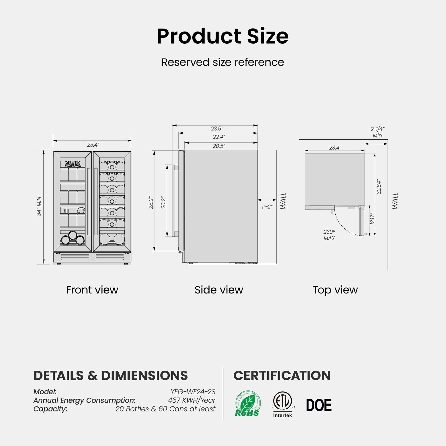 • Grande capacité : pouvant accueillir 20 bouteilles de Bordeaux standard de 750 ml et jusqu’à 60 canettes de 350 ml, le réfrigérateur à vin Yeego répond à tous vos besoins en matière de réception. Le côté droit du réfrigérateur est équipé de six clayettes amovibles en bois pour le vin, tandis que le côté gauche offre trois grilles métalliques réglables pour les boissons, offrant ainsi une solution de rangement flexible pour différentes tailles de bouteilles et de canettes.