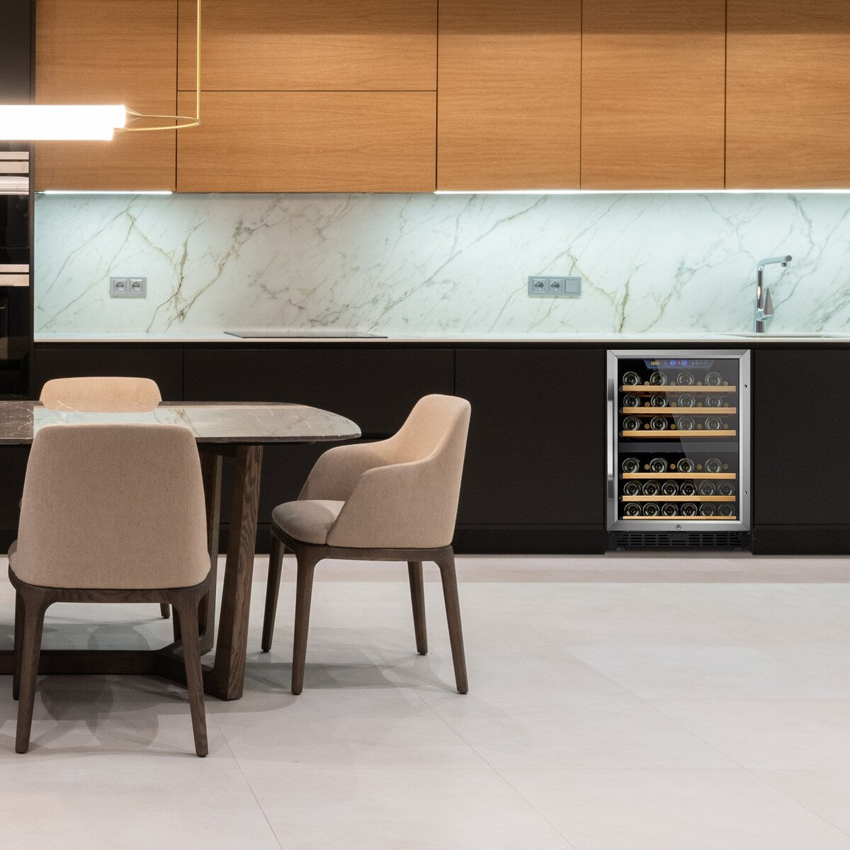 Ajoutez une touche d'élégance à votre cuisine avec cette cave à vin à compresseur Lanbo de 61 cm (24 pouces) encastrable à deux zones, capable de contenir jusqu'à 44 bouteilles de Bordeaux standard. Grâce à ses deux zones de température contrôlée, conservez vos vins blancs et rouges à la température idéale pour une dégustation optimale. La porte en verre trempé à double vitrage et protégée contre les UV, ainsi que l'éclairage LED automatique, vous permettent de trouver facilement la bouteille souhaitée. De plus, le refroidissement par ventilateur et les clayettes en hêtre garantissent la fraîcheur et la saveur de votre vin.