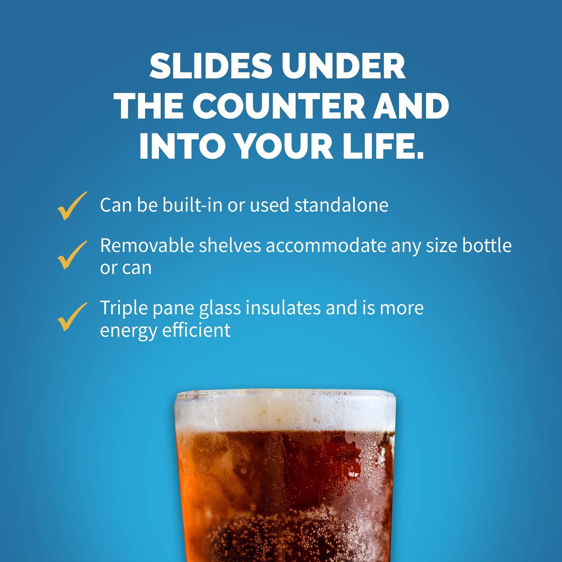 Grâce à son système de compresseur silencieux à ventilation frontale, ce réfrigérateur à boissons spacieux s'intègre facilement sous les comptoirs de cuisine standard. Glissez-le simplement pour un look élégant et intégré qui s'harmonise parfaitement avec vos meubles, ou laissez-le seul. À vous de choisir.