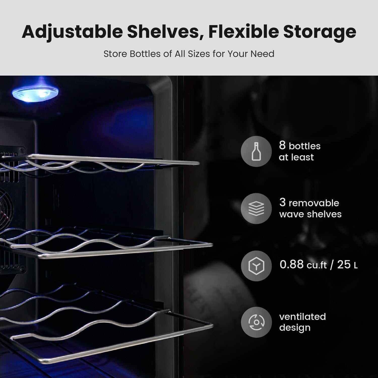• Rangement polyvalent : peut accueillir 8 bouteilles de Bordeaux standard de 750 ml avec trois casiers à vin amovibles, permettant une flexibilité pour différentes tailles et types de bouteilles.