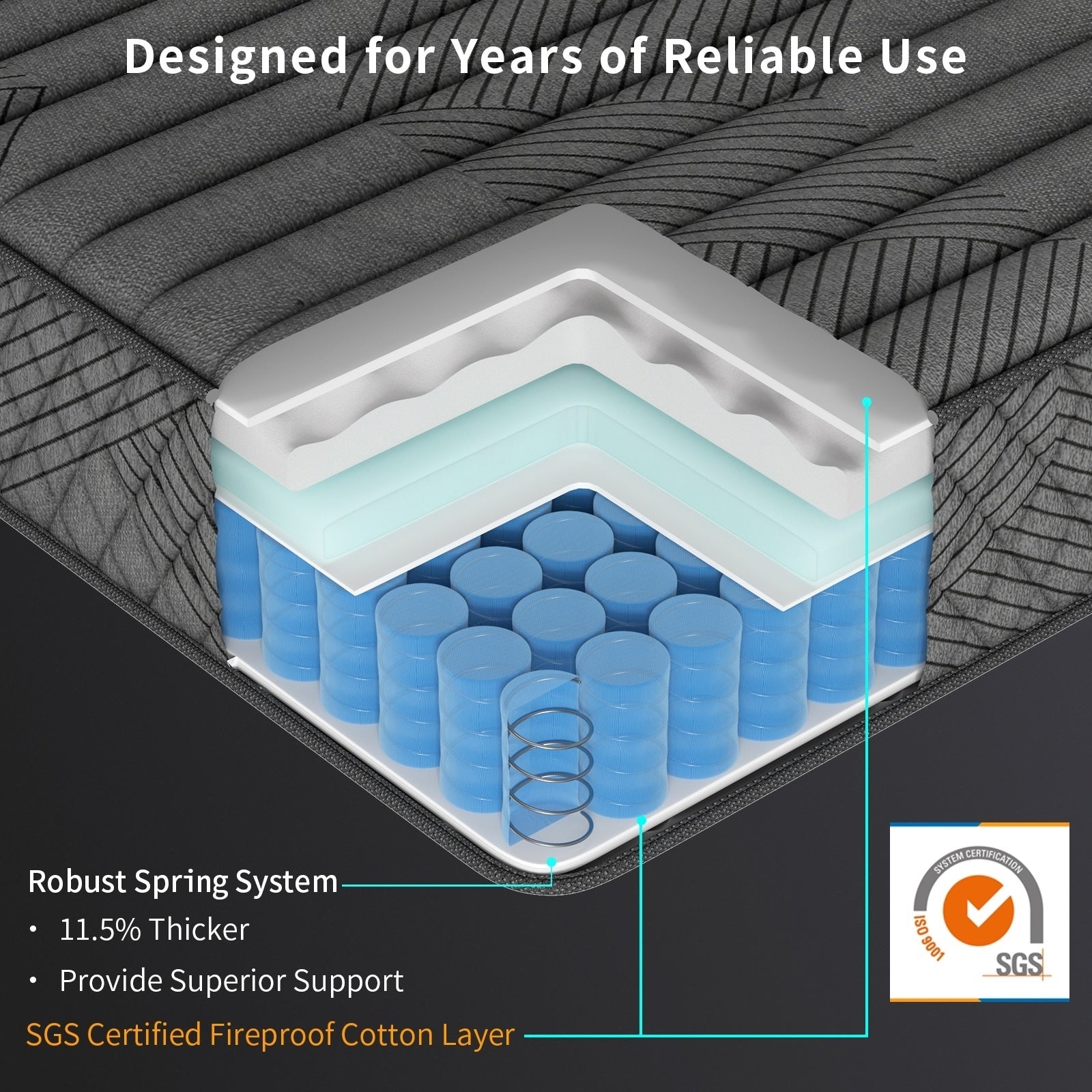 • Ressorts hélicoïdaux 11,5 % plus épais que la norme du marché : Offrent un meilleur soutien, une durée de vie plus longue et empêchent l'effondrement.