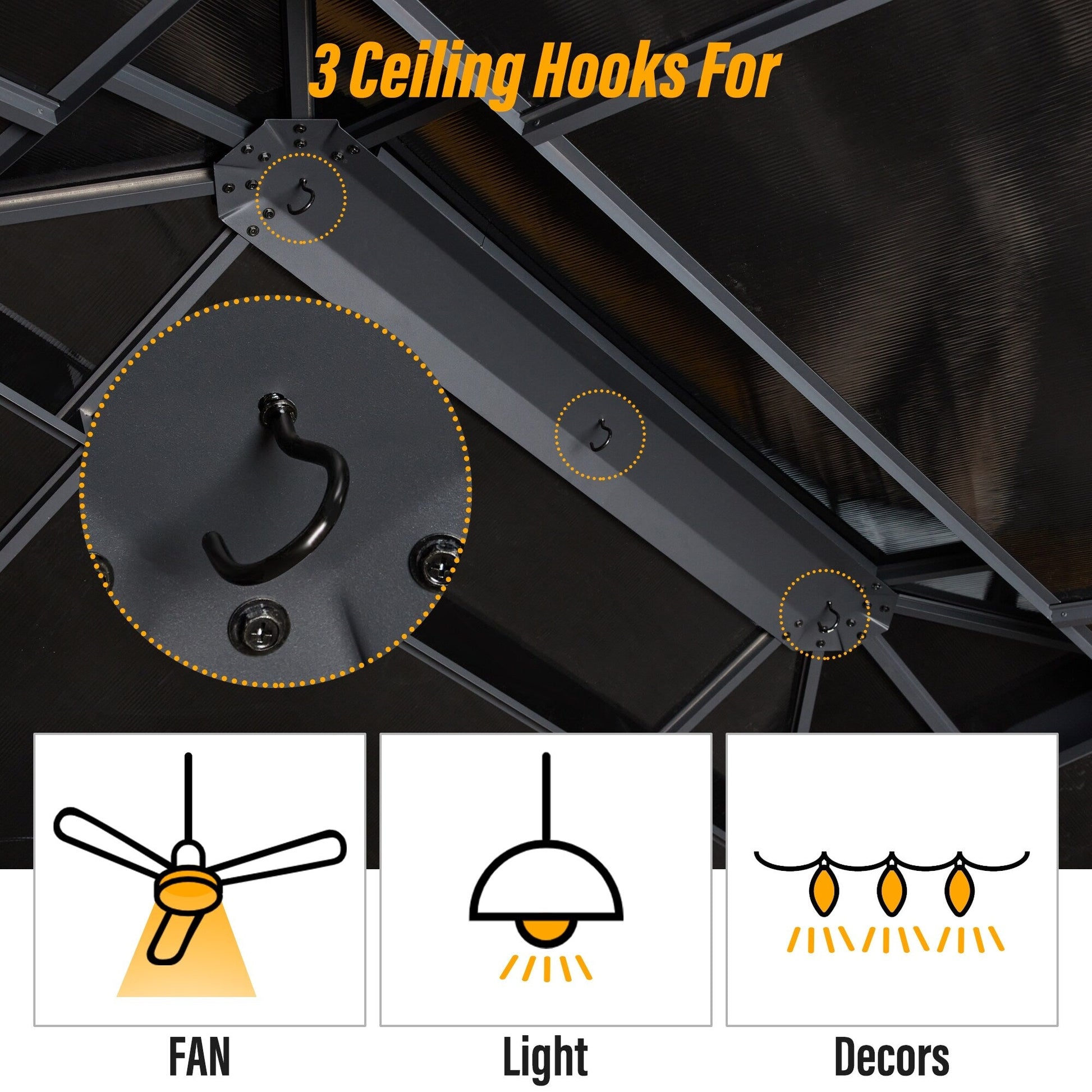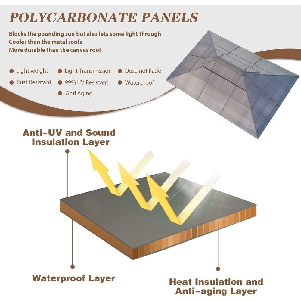 Ce gazebo haut de gamme s'adapte à tous les scénarios : barbecues en terrasse, pique-niques, thés en terrasse, barbecues dans la cour, rassemblements dans le jardin ou détente au bord de la piscine. Son design élégant offre une protection idéale contre l'ombre, tandis que sa structure ouverte accueille parfaitement un barbecue et un ensemble table et chaises pour 7 à 9 personnes , optimisant ainsi votre expérience en plein air, du café du matin aux repas du soir, avec un confort et une praticité optimaux.