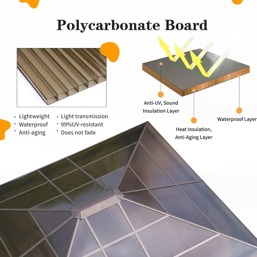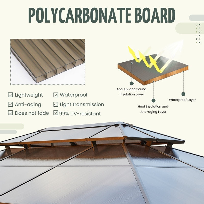 Ce gazebo présente un design raffiné à double toit avec des espaces de ventilation optimisés, favorisant une meilleure circulation de l'air pour un environnement plus frais et plus confortable. Les aérations latérales intégrées et dissimulées s'harmonisent avec la conception du toit pour aspirer activement l'air frais tout en facilitant l'évacuation de l'air chaud, créant ainsi une convection naturelle même lors des pics de chaleur estivale. Ce système intelligent de gestion de la circulation de l'air assure une protection solaire complète tout en maintenant une circulation d'air rafraîchissante, offrant ainsi une combinaison idéale d'ombre et de brise, comparable au confort d'une canopée naturelle.