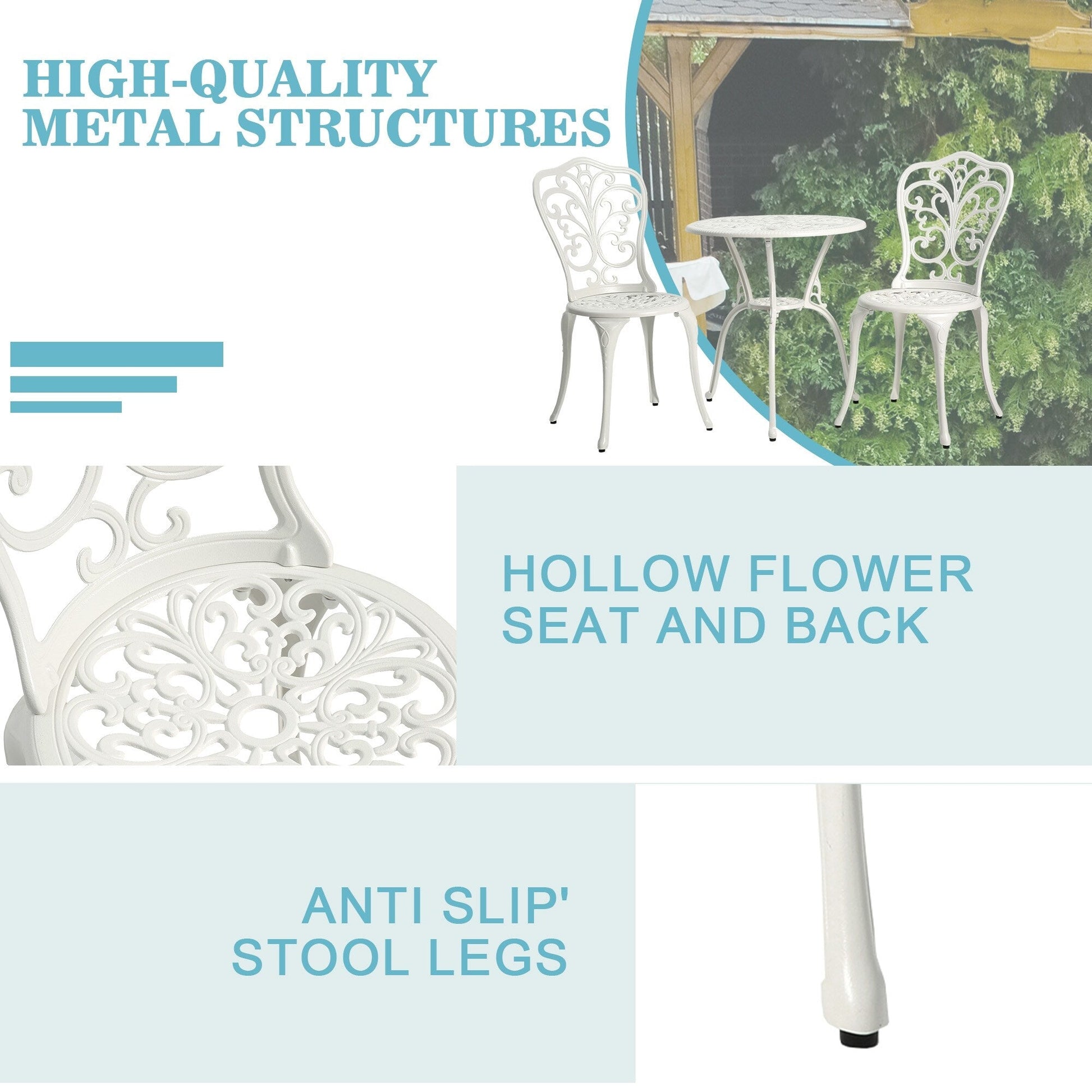 Profitez de votre espace extérieur avec cet ensemble de table bistrot 3 pièces en aluminium, orné de magnifiques sculptures de papillons et de finitions en cuivre antique. Fabriqué en fonte d'aluminium robuste avec traitement antirouille et résistant aux intempéries, cet ensemble est adapté à une utilisation par tous les temps et résiste à l'oxydation. Grâce à son trou pour parasol intégré de 4,4 cm, vous pouvez y ajouter un parasol de 2,3 m (non inclus) pour vous protéger du soleil et de la pluie. Facile à nettoyer et à assembler, cet ensemble est parfait pour décorer votre cour, votre bord de piscine, votre terrasse, votre jardin ou votre véranda.