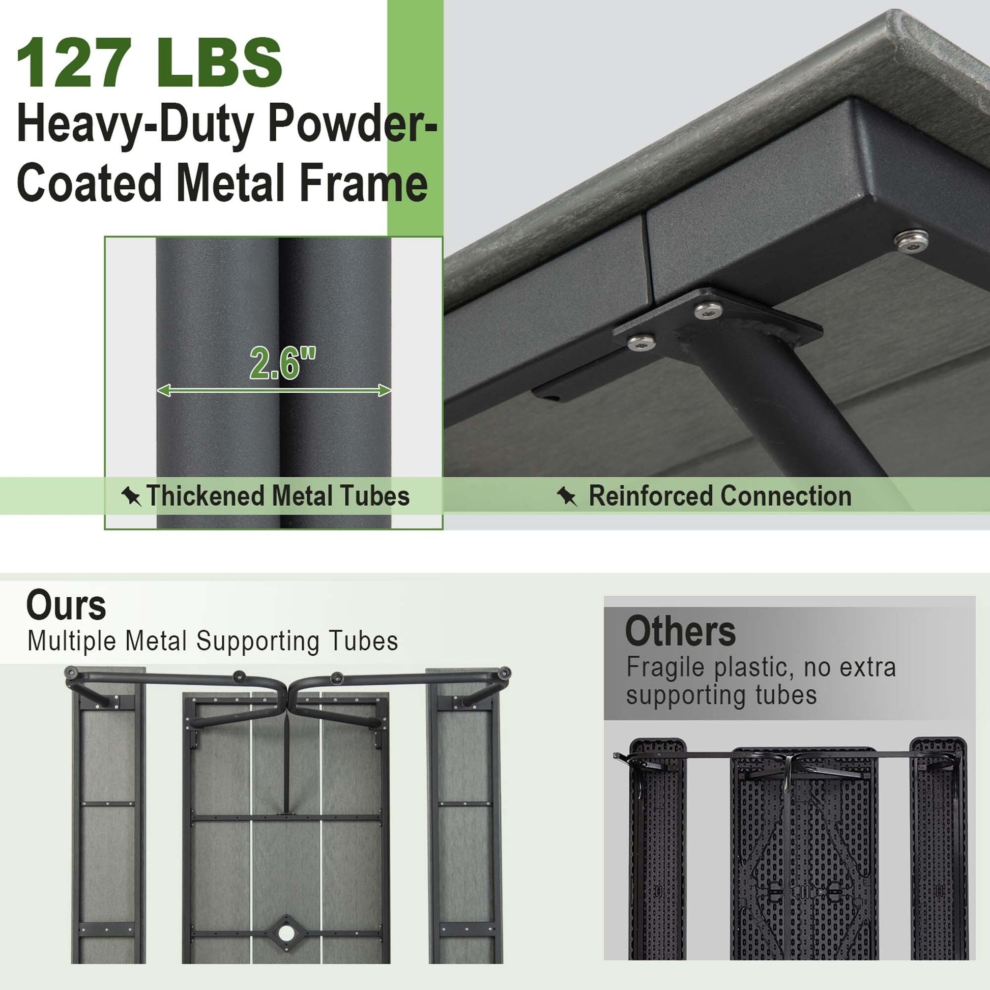La table de pique-nique peut supporter jusqu'à 350 lb, chaque banc peut supporter jusqu'à 1100 lb